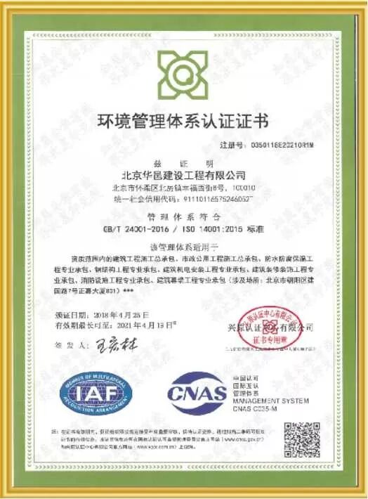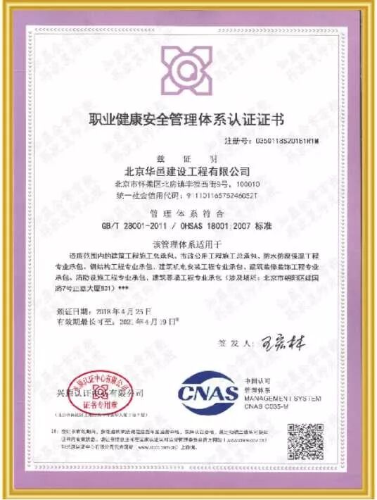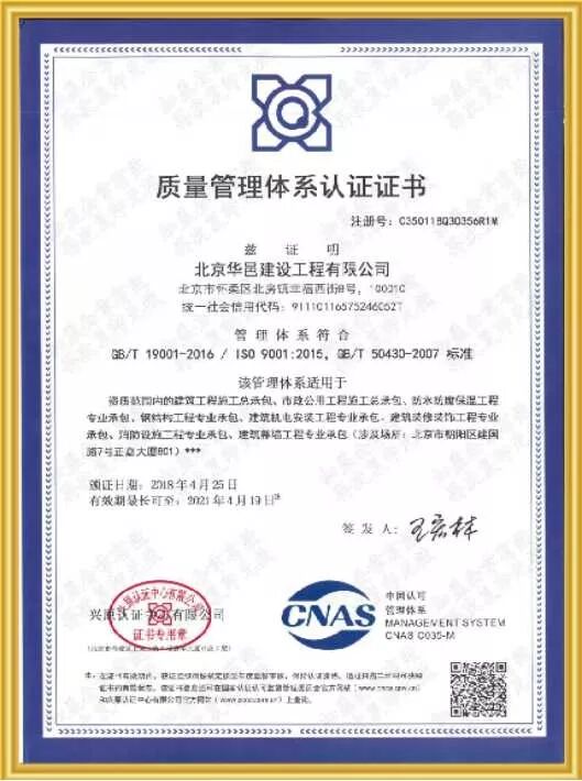 公司通过《质量管理》、《环境管理》、《职业健康安全管理》三个国际标准化体系认证。具备了承接建筑工程、高档装饰、市政设施、消防设施、机电设备安装等大中型项目的综合施工能力。到目前为止,华邑建设的客户群有国家机关事务管理局、中央军委机关事务管理总局、北京大学、清华大学、北京协和医学院等100多家国有企事业单位,华邑建设现为中国建筑装饰协会会员单位,连续5年被评为北京建设行业诚信企业,AAA级信用等级企业,2013年-2019年连续入围中央国家机关工程定点采购单位。