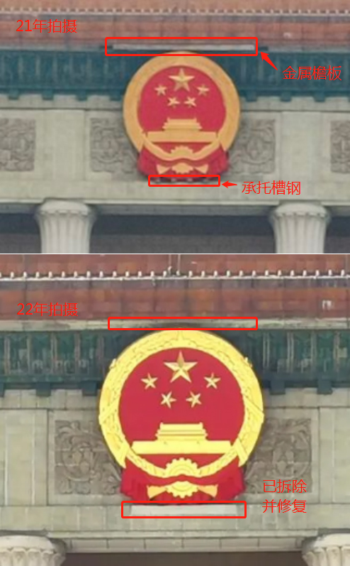 此次工程除了重头戏更换国徽外,还计划对国徽原吊挂系统进行维修加固,拆除国徽上部的金属檐板,同时对国徽底部承托的四根槽钢进行隐藏,以实现东门国徽视觉效果的优化。