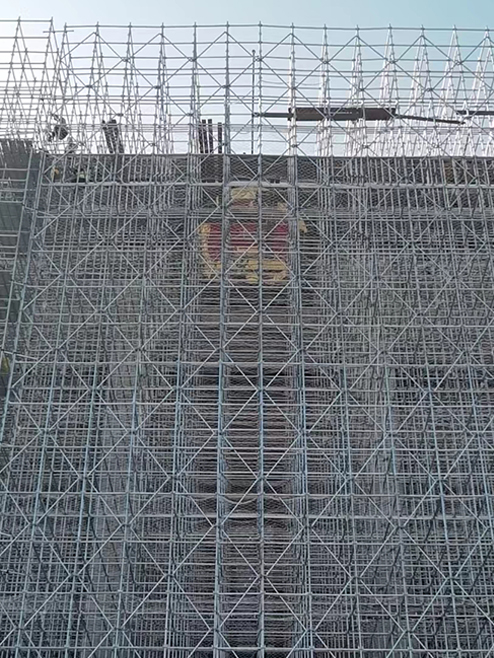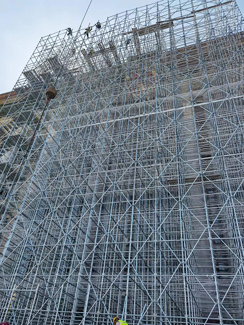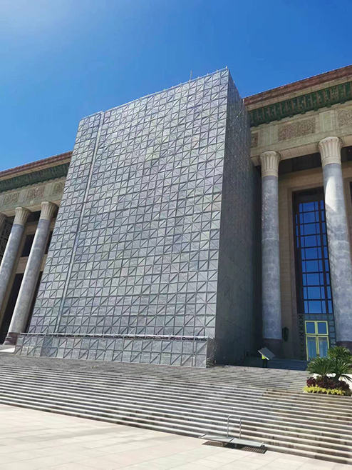 此次工程面临的首要问题就是施工中使用的脚手架。人民大会堂高46.5米,脚手架的搭建高度要达到45米左右,而且这中间是没有其它承重支点的。此次的脚手架既要保证施工的安全性、稳定性、施工便捷性,又要保证施工场景与整体环境的和谐统一,不过多影响到广场参观群众的视觉参观效果,为此人民大会堂管理局和我司施工技术团队对脚手架的搭建方案进行了多次的讨论。