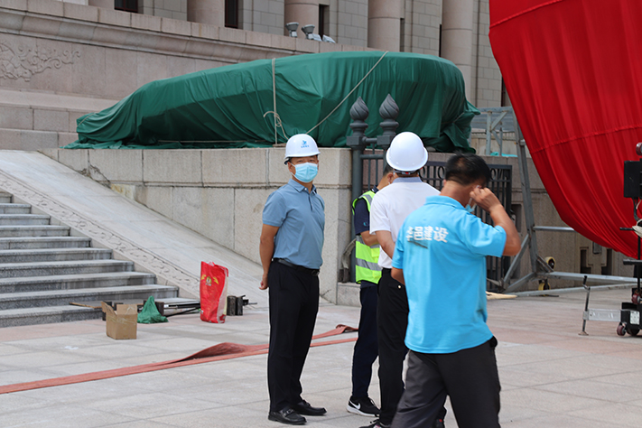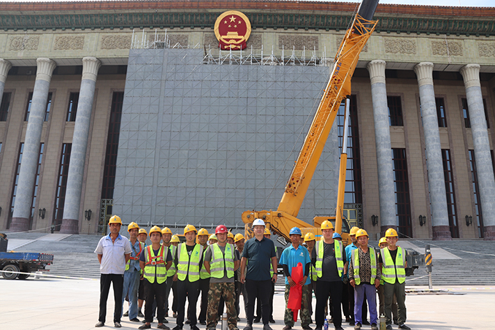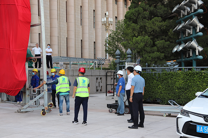 在施工阶段,公司领导也多次到施工现场亲自督促施工作业、跟进施工进度,着重强调在保证施工进度的同时,必须严格按照施工安全规范操作,落实各方面的施工安全责任。全力以赴,争取零失误完成此次的国徽更换工作。保证国庆假日期间市民和广大游客可以一睹新国徽的风采!